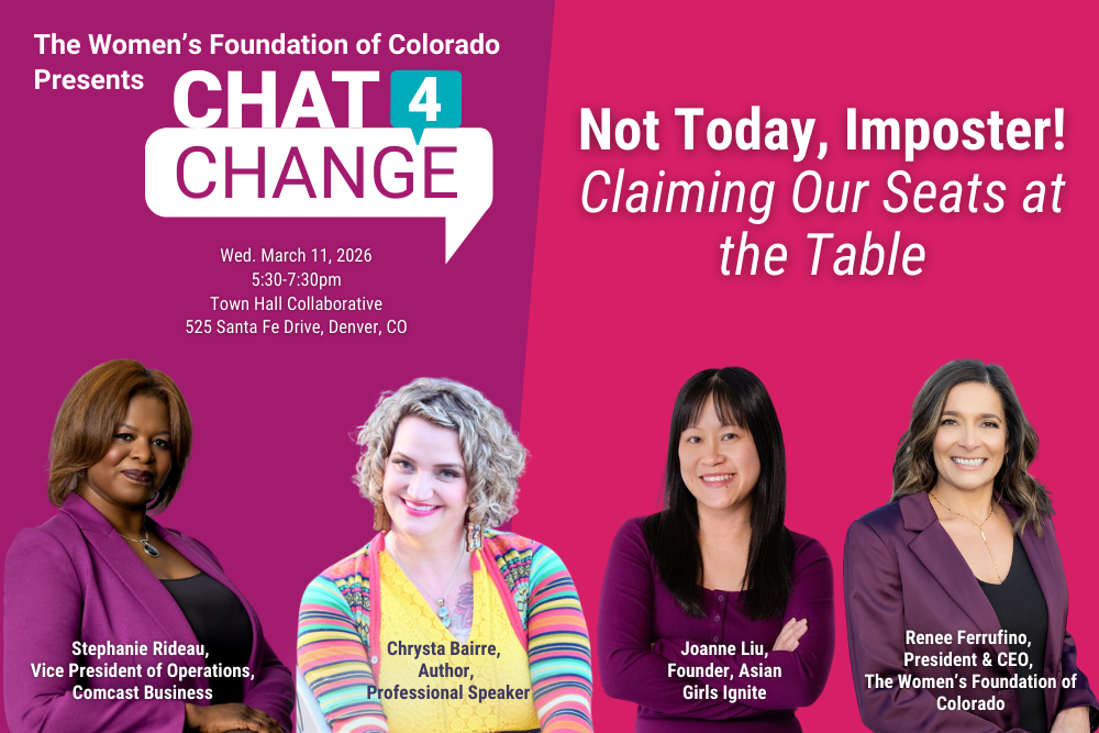 Join The Women’s Foundation of Colorado on the evening of March 11 for an intimate, interactive conversation, where three women from different cultures, professions, and lived experiences will share how they’ve navigated self-doubt, visibility, and belonging. Together, we’ll reflect on how as women we can claim space, recognize our impact, and show up with greater clarity and confidence—without needing anyone’s permission.
